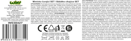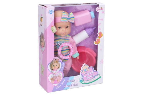 Miminko čurající. Velikost 25cm. Obsahuje miminko, lahvičku na pití, pudr, nočník. Zvukové efekty, aktivace tlačítkem na bříšku. Pije a čurá. 3xAG13 baterie součástí.
