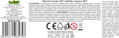 Miminko čurající. Velikost 30cm. Miminko pije z lahvičky, čurá, vydává zvuky. Obsahuje: panenku, dudlík, nočník, lahvičku, kelímek, kartáček, rodný list, pastu na zuby. 3xAG13 baterie součástí balení.