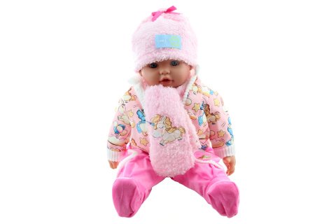 Panenka velká – miminko holka – s měkkým tělem o velikosti cca 50 x 27 x 13 cm. Oblečení lze sundat. Materiál plast+polyester+výplň. Konce končetin a hlava jsou z plastu. Baleno v sáčku. Věk 3+