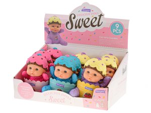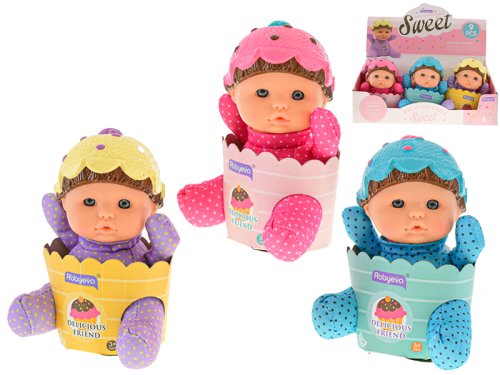 Roztomilé miminko s měkkým tělíčkem zabalené v papírovém košíčku bude skvělým spoelčníkem každé malé holčičky. Panenka je o velikosti 15 cm. Dostupné jsou 3 barvy - růžová, modrá a fialová. Vhodné pro děti od 3 let.