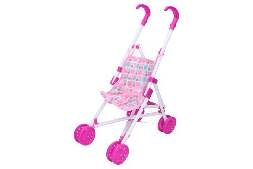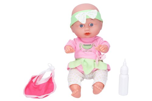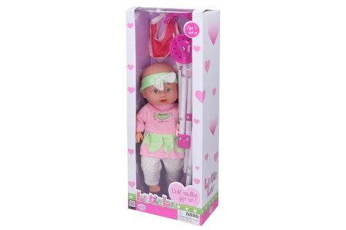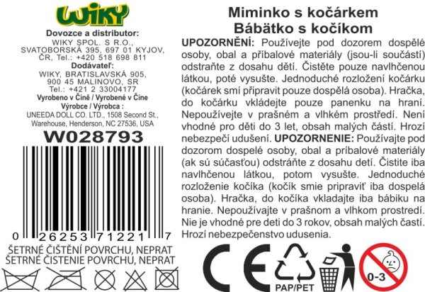 Miminko s kočárkem. Velikost 28 cm. Balení obsahuje miminko, složený kočárek, bryndáček a lahvičku.