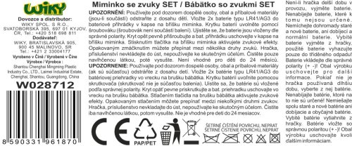 Miminko se zvuky a doplňky. Velikost 41 cm. Balení obsahuje miminko, talířek s vidličkou a lžičkou, chrastítko a plenku. Po stlačení bříška vydává zvuky: říká mama, papa, směje se, žvatlá. Měkké tělíčko. 2 varianty - růžová, modrá.