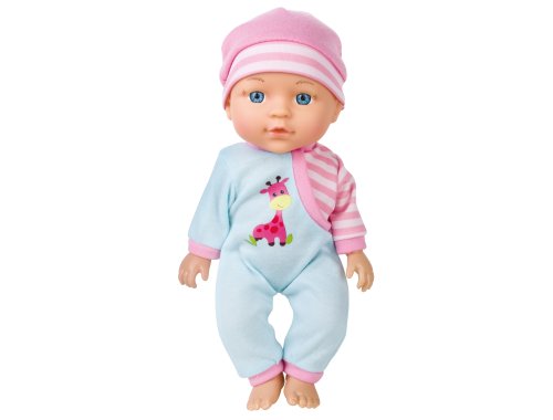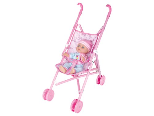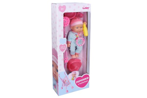 Miminko se zvuky a kočárkem. Velikost 27 cm. Balení obsahuje miminko, složený kočárek, mističku s příborem, nočník, lahvičku. Po zmáčknutí bříška zvukové efekty. 3xAG13 baterie součástí.