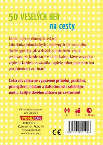 Tato sbírka jednoduchých a zábavných her vám nabízí skvělé způsoby, jak si zkrátit pomalu běžící čas při cestování. Na každé kartě v tomto balení, které se snadno vejde do každého zavazadla, najdete jednu příjemnou hru pro jednoho či více hráčů. Čeká vás zábavné vyprávění příběhů, počítání, přemýšlení, hádaní a další činnosti zahánějící nudu.