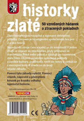 50 vznešených hádanek o ztracených pokladech pro udatné rytíře a princezny od 8 let. Nasedni do stroje času a vydej se do minulosti! V jednu chvíli se objevíš ve středověku, jindy přistaneš ve starověkém Římě nebo pátráš v džungli po tajemném zlatu Inků. Objevíš pověstmi opředené poklady a zaniklé kultury, potáhneš s rytíři do bitvy a setkáš se s mocnými králi. A všude se skrývají nějaké záhady. Zlaté historky jsou zapeklité a tajuplné záhady pro děti i dospělé. Zároveň je to originální společenská hra pro 2 a více hráčů. Pravidla hry: Jeden hráč zná celý příběh. Všichni ostatní znají jen část pomocí dobře mířených otázek, dedukce a odhadu se pokoušejí poskládat jednotlivé střípky a odhalit, jak se příběh doopravdy stal. Hra obsahuje: 50 zlatých historek, pravidla hry