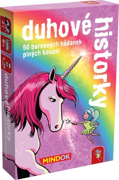 Duhové historky jsou tajuplné a zajímavé detektivní příběhy. Zároveň je to originální společenská hra pro 2 a více hráčů. Nechte se obklopit světem barevných kouzel. Setkáte se s odvážnými skřítky, překrásnými vílami a elegantními jednorožci. Čekají vás také zlé čarodějnice, záludní draci a řada dalších fascinujících bytostí. V každé hádance na vás čeká magická záhada a její řešení může jako kouzlem prozářit váš svět. Hra obsahuje: