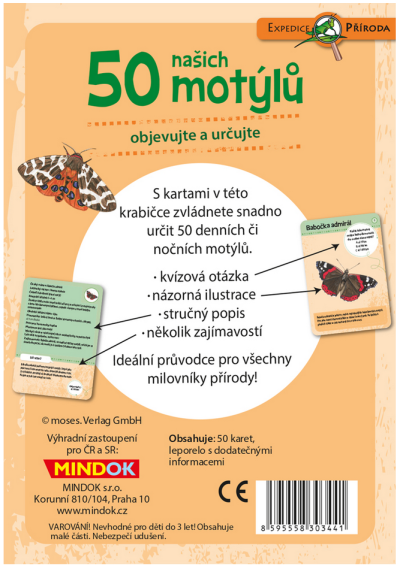 S kartami v této krabičce zvládnete snadno určit 50 denních či nočních motýlů. Na kartách najdete kvízovou otázku, názornou ilustraci, základní informace a také několik zajímavostí. Ideální průvodce pro všechny milovníky přírody! Balení obsahuje: 50 karet, leporelo s dodatečnými informacemi.