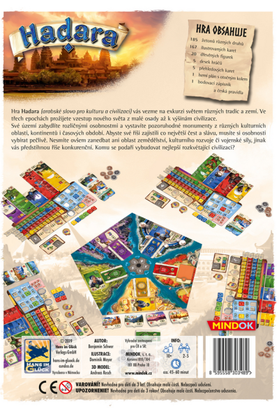 Hra Hadara vás zavede do světa různých kultur a zemí! Ve třech epochách prožijete vzestup nového světa z malé osady až k výšinám civilizace. Své území zabydlíte rozličnými osobnostmi, pocházejícími z různých kulturních oblastí, kontinentů i časových období. Abyste své říši zajistili co největší čest a slávu, musíte si osobnosti vybírat pečlivě. Nesmíte ovšem zanedbat ani oblast zemědělství, kulturního rozvoje či vojenské síly, jinak vás předstihnou říše konkurenční. Komu se podaří vytvořit novou, kvetoucí kulturu nejvyšší úrovně? Balení obsahuje: