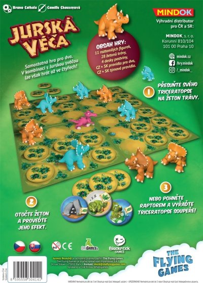 Mladí triceratopsové (nebo zkráceně topsíci) ze všeho nejraději okusují lístky na pastvinách, kde bydlí. Dokonce rádi pořádají soutěže, který tým topsíků dokáže lístečků sníst víc. Pokud se ovšem do hry nevloží nebezpečný velociraptor, schopný všechny nebohé topsíky úplně zaplašit! Jurská véča je hra pro dva hráče zcela nezávislá na hře Jurská sváča. Pokud však máte obě hry, můžete je zkombinovat do jedné týmové hry pro až 4 hráče dle pravidel na samostatném listu. Hra obsahuje: