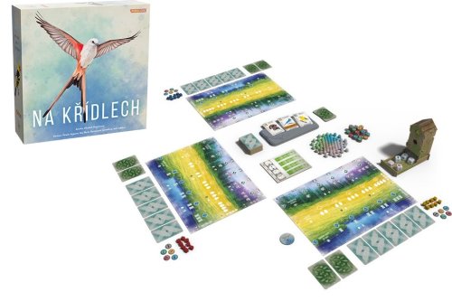 Ve hře Na křídlech budete představovat nadšené ornitology, pozorovatele ptactva, badatele a sběratele, snažící se přilákat do své voliéry co nejúžasnější ptačí exempláře. Voliéra zahrnuje tři různé biotopy a každý pták pomůže rozvinout vaši ptačí zoo v určité oblasti: shánění potravy, snášení vajec a získávání nových přírůstků do voliéry. Vítězem hry se stane hráč, jemuž se podaří získat nejvíce bodů. Body lze získat za zajímavé ptáky ve sbírce, plněním různých úkolů vyhodnocovaných během hry i na jejím konci, za snůšku vajec, akumulovanou potravu a kořist. Hra obsahuje 1 pravidla hry, 1 příloha, 1 pravidla sólové hry, 1 deska úkolů, 1 plastová krabička na karty, 5 voliér hráčů, 1 model budky s krmítkem, 1bodovací zápisník, 170 různých karet ptáků, 26 karet osobních úkolů, 16 karet pro sólovou hru, 75 vajec, 5 kostek potravy, 40 akčních kostiček (po 8 v 5 barvách hráčů), 103 žetonů potravy pěti různých druhů, 8 destiček veřejných úkolů, 1 žeton začínajícího hráče.