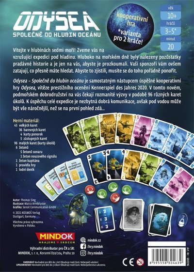 Vítejte v hlubinách sedmi moří! Zveme vás na vzrušující expedici pod hladinu. Hluboko na mořském dně byly nalezeny pozůstatky pradávné historie a je jen na vás, abyste je prozkoumali. Vaši sponzoři vám ovšem zatajují, co přesně máte hledat. Abyste to zjistili, musíte se do toho pořádně ponořit. Odysea – Společně do hlubin oceánu je samostatným nástupcem úspěšné kooperativní hry Odysea, vítěze prestižního ocenění Kennerspiel des Jahres 2020. V tomto novém, podmořském dobrodružství na vás čekají rozmanité výzvy v podobě 96 různých karet úkolů. K úspěchu celé expedice je nezbytná dobrá komunikace, avšak pod vodou může být vše náročnější, než se na první pohled zdá… Hra obsahuje: