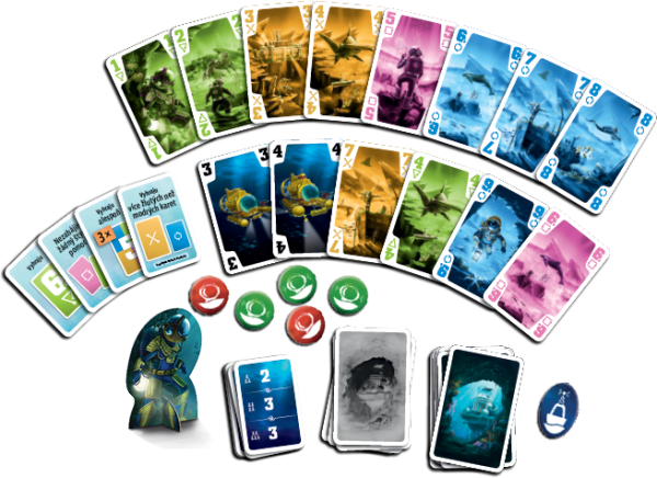 45 velkých karet (36 barevných karet, 4 karty ponorek, 5 zástupných karet) 96 malých karet (karty úkolů) 6 žetonů (5 žetonů sonaru, 1 žeton nouzového signálu) 1 žeton kapitána 1 pravidla hry 1 lodní deník