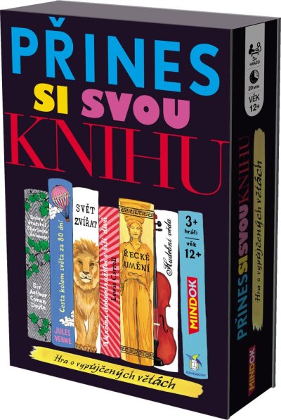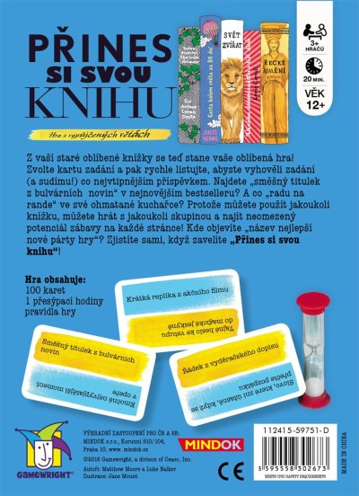 Z vaší staré oblíbené knížky se teď stane vaše oblíbená hra! Zvolte kartu zadání a pak rychle listujte, abyste vyhověli zadání (a sudímu!) co nejvtipnějším příspěvkem. Najdete „směšný titulek z bulvárních novin“ v nejnovějším bestselleru? A co „radu na rande“ ve své ohmatané kuchařce? Protože můžete použít jakoukoli knížku, můžete hrát s jakoukoli skupinou a najít neomezený potenciál zábavy na každé stránce! Kde objevíte „název nejlepší nové párty hry“? Zjistíte sami, když zavelíte „Přines si svou knihu“! Hra obsahuje: 100 karet, 1 přesýpací hodiny, pravidla hry.
