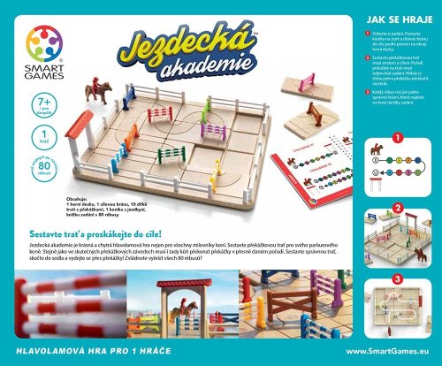Sestavte trať a proskákejte do cíle! Jezdecká akademie je krásná a chytrá hlavolamová hra nejen pro všechny milovníky koní. Sestavte překážkovou trať pro svého parkurového koně. Stejně jako ve skutečných překážkových závodech musí i tady kůň překonat překážky v přesně daném pořadí. Sestavte správnou trať, skočte do sedla a vydejte se přes překážky. Zvládnete vyřešit všech 80 rébusů? Balení obsahuje: