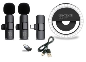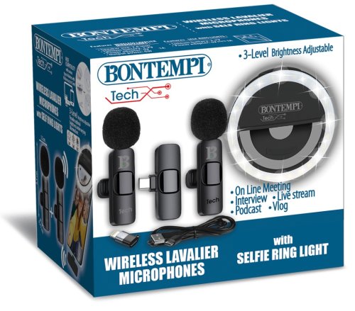 Kompaktní sada ideální pro natáčení videí, vlogování, podcasty, živá vysílání na Facebooku, YouTube a další platformy. Obsahuje mini kruhové LED světlo pro optimální osvětlení obličeje a dva bezdrátové klopové mikrofony pro čistý a profesionální zvuk. Mikrofony jsou kompatibilní s USB-C zařízeními (např. moderní chytré telefony a tablety). Snadné použití, ideální řešení pro tvůrce obsahu na cestách. Kruhové světlo- tři úrovně jasu.