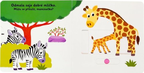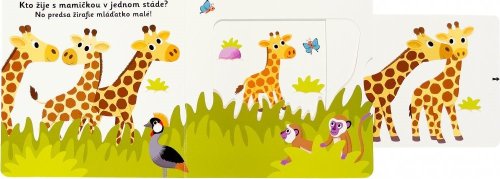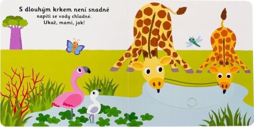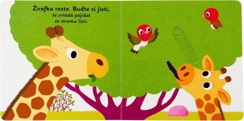 Malá žirafka žije se svojí maminkou ve stádě a spolu zažívají spoustu dobrodružství. Sledujte, jak se žirafka musí snažit, aby svým dlouhým krkem dosáhla na chutné listy v koruně stromu či se napila z chladivé řeky. Objevovat svět s tímto leporelem pro nejmenší děti od jednoho roku je tak zábavné! Pevné stránky s pohyblivými prvky procvičí i jemnou motoriku. Stačí jen vložit prstík do správného otvoru a lehce vysunout, zatáhnout nebo otočit a hned bude váš malý objevitel znát odpovědi.