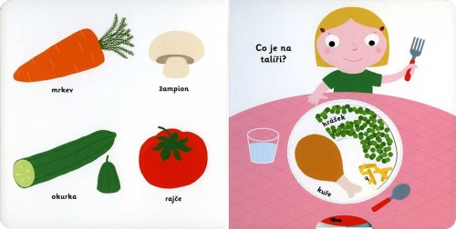 Víš, jak vypadá jahoda a jakou má barvu? A poznáš květák? V této knížce naleznete mnoho ilustrací potravin a jídel, se kterými se ty nejmenší strávníci mohou běžně setkávat. Vrhněte se s dětmi do učení a prohlížení si v knížce z oblíbené řady MiniPEDIE. Díky otáčivému kolečku je leporelo ještě zábavnější a děti si tak velice snadno procvičí jemnou motoriku.Knížka s prvky MontessoriČeské vydání publikace nakladatelství Nathan