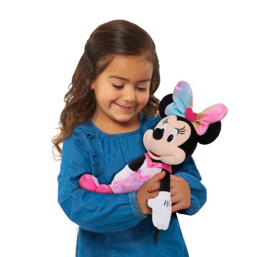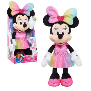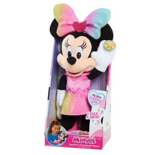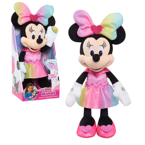 Děti mohou zpívat a tančit, zatímco Minnie myška zpívá „Minnie's Bow-Toon Are Waiting for You!“ Minnie myška předvádí úžasný výkon v třpytivém duhovém outfitu s odpovídající svítící mašlí! Tento interaktivní plyš má růžové srdce na jejích botách a její charakteristickou mašli! Její šaty mají dokonce rozkošný srdíčkový pásek v pase. Minnie Mouse má ideální velikost pro malé ruce a je dodávána ze super měkkých látek. Určitě se okamžitě stane nejlepší kamarádkou! Vyžaduje 2 x AAA baterie (součástí balení). Věk 3+
