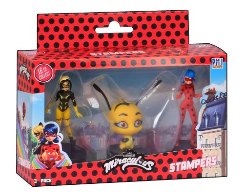 Tři kouzelné figurky z pohádky Miraculous: Beruška a černý kocour s razítky. Tyto figurky mají ve spodní části razítka, takže děti si mohou ozdobit školní práce, vytvořit nové obrázky a další. Vhodné pro děti od 3 let.