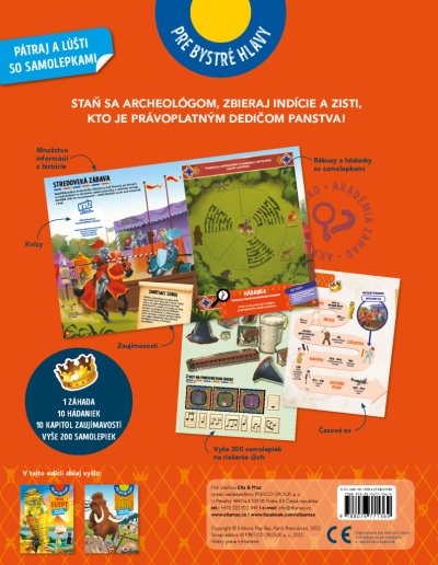 Vydejte se na dobrodružnou misi s krycím názvem STŘEDOVĚK! Akademie záhad, jež řeší hádanky staré stovky, tisíce, ba miliony let, má pro vás zapeklitý případ. Šest šlechticů se nemůže dohodnout, komu patří hradní panství, které měl v držení jejich předek. Vypravte se na středověký hrad, zjistěte více o zdejších šlechticích a určete, kdo jej má po právu získat. Jen pokud se dokážete úspěšně popasovat se všemi rébusy, kvízy a úkoly, dokážete zabránit válce o dědictví! Máte na to přes 150 samolepek, a navíc se dozvíte spoustu poutavých informací a zajímavostí z historie.