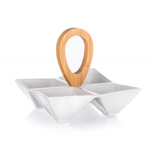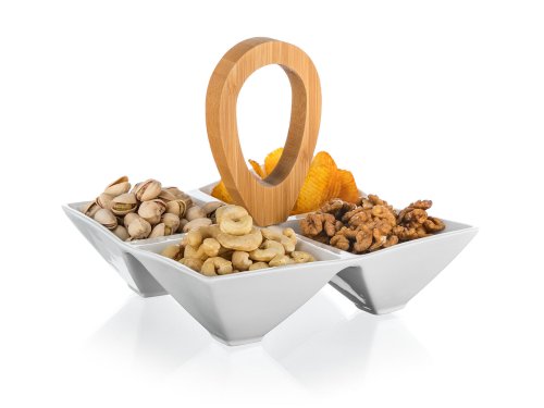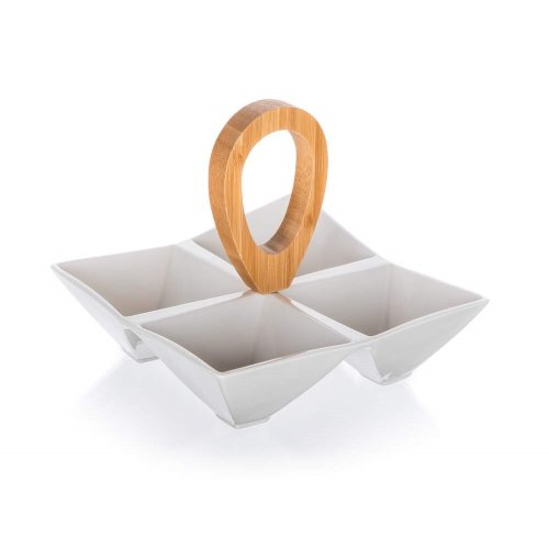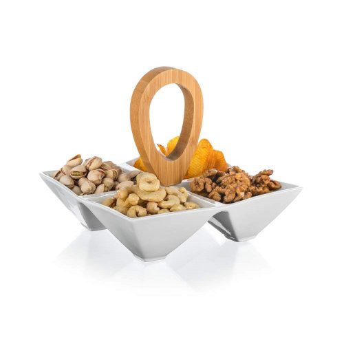Čtyři Hranaté dělené porcelánové misky, s bambusovým držákem, o celkových rozměrech 21 x 21 x 17,5 cm. Miska je ideální pro servírování různých druhů oříšků, sušeného ovoce, oliv apod.