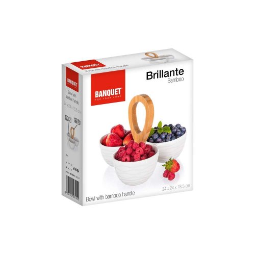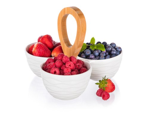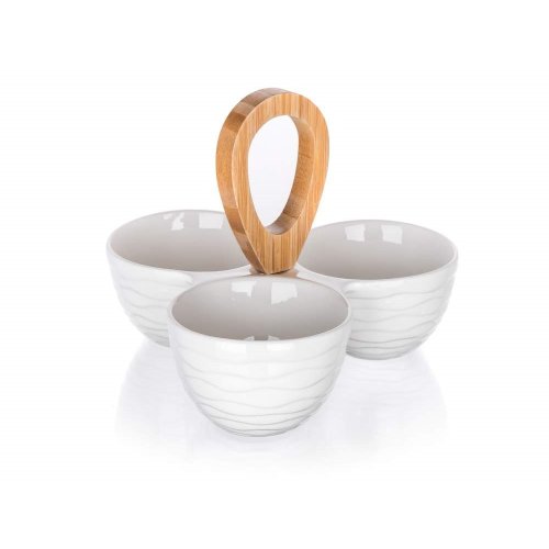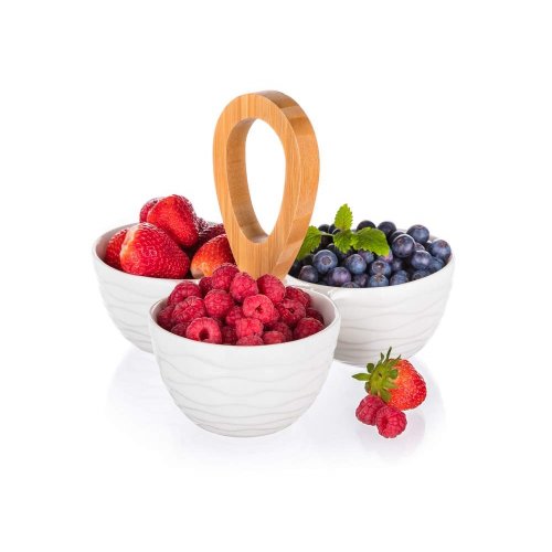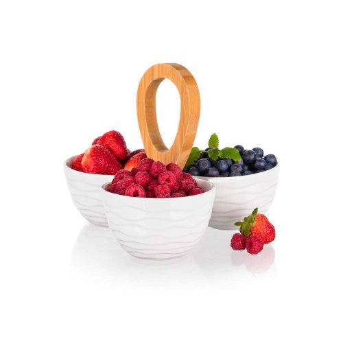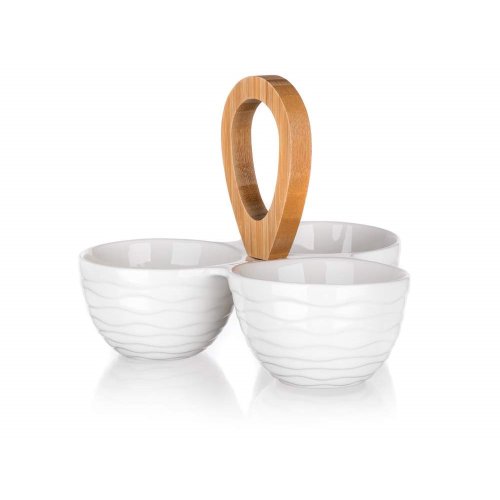 Tři kulaté dělené porcelánové misky, s bambusovým držákem, o celkových rozměrech 24 x 24 x 18,5 cm. Miska je ideální pro servírování různých druhů oříšků, sušeného ovoce, oliv apod.