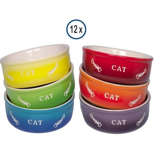 Keramické misky Gradient s lesklou glazurou jsou určené na krmivo nebo vodu pro kočky. Misky jsou v jasných pastelových barvách s lehkým přechodem do ztracena. Od každé barvy jsou v sadě 2 kusy. Rozměry (cca): průměr 13,5 cm, výška 4,5 cm Objem: 0,25 l Barva: žlutá, zelená, modrá, červená, oranžová a fialová.