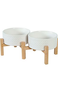 2 keramické misky pro psy i kočky v elegantním designu. Misky jsou na společné bambusové podnoži, která je opatřena protiskluzovými podložkami.