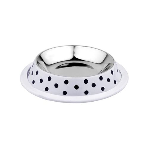 Miska Duvoplus Deco Fix na krmivo nebo vodu pro kočky a malé psy je vyrobena z broušené nerezové oceli. Spodní okraj má gumový lem, aby miska na podlaze neklouzala a nedělala hluk. Stylový vzhled jí dodává moderní potisk s puntíky. Vhodná pouze pro ruční mytí. Rozměry (cca): Ø 21 × 4,2 cm Objem: 460 ml Materiál: nerezová ocel Barva: stříbrná, bílá, černá Vzor: puntíky