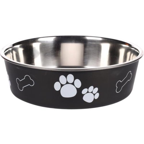 Odolná a hygienická nerezová miska je vhodná na suchou i mokrou stravu nebo vodu. Snímatelný gumový kroužek na spodní straně dna zabraňuje klouzání a tlumí hluk. Misku bez gumového kroužku lze mýt v myčce. Barva: černá s bílou tlapkou Objem: 1 500 ml