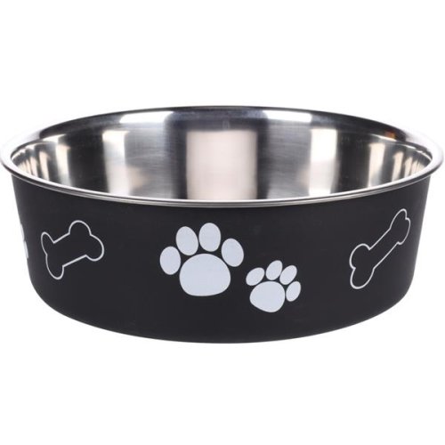 Odolná a hygienická nerezová miska je vhodná na suchou i mokrou stravu nebo vodu. Snímatelný gumový kroužek na spodní straně dna zabraňuje klouzání a tlumí hluk. Misku bez gumového kroužku lze mýt v myčce. Barva: černá s bílou tlapkou Objem: 2 200 ml