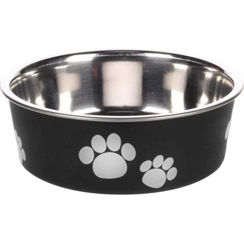 Odolná a hygienická nerezová miska je vhodná na suchou i mokrou stravu nebo vodu. Snímatelný gumový kroužek na spodní straně dna zabraňuje klouzání a tlumí hluk. Misku bez gumového kroužku lze mýt v myčce. Barva: černá s bílou tlapkou Objem: 300 ml