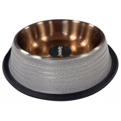 Miska na krmivo nebo vodu pro psy je vyrobená z nerezové oceli s měděnou povrchovou úpravou. Spodní okraj je opatřený gumovým lemem, který zabraňuje klouzání a snižuje riziko rozlití. Vhodná pouze pro ruční mytí. Rozměry (cca): Ø 34 cm Objem: 2 800 ml Materiál: nerezová ocel Barva: bílá