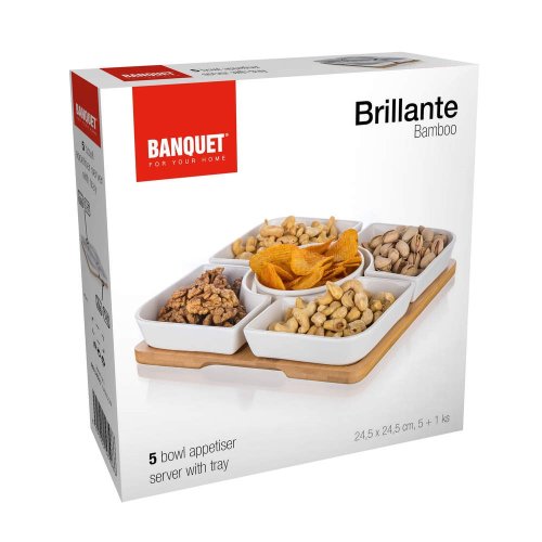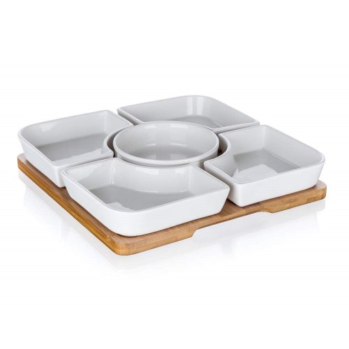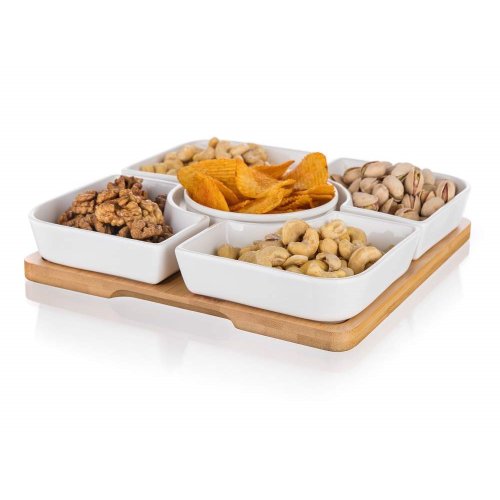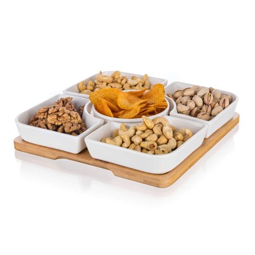 Sada pěti hranatých a jedné kulaté porcelánové misky, na čtvercovém bambusovém podnosu, o celkových rozměrech 24,5 x 24,5 x 4,5 cm, je ideální pro servírování různých druhů oříšků, sušeného ovoce, oliv apod.