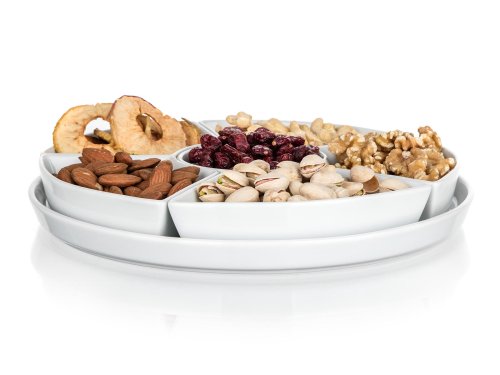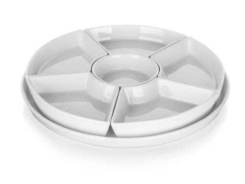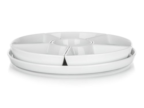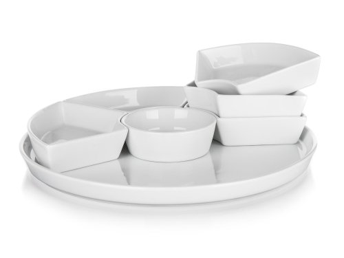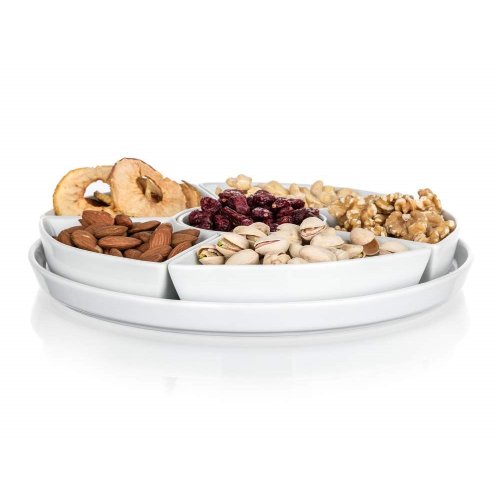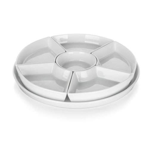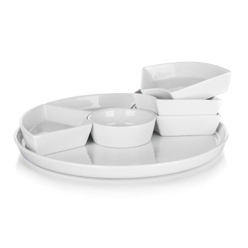 Servírovací sada kulatá porcelánová BIANCA v bílé barvě, se skládá z kulatého podnosu a 6 mističek různého tvaru. Tato sada má široké využití. Podnos můžete využít na servírování jednohubek, chlebíčků, koláčů, dortů či mini dortíků. Do jednotlivých malých mističek můžete dát různé dipy, marmelády, sypání, oříšky, ovoce nebo zeleninu. Vhodné pro každodenní použití. Sada je vhodná do myčky na nádobí.