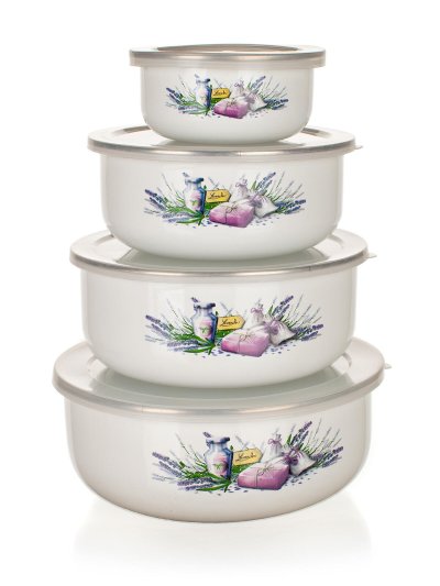 Miska sada 8díl. (10, 14, 16, 18 cm + 4 víčka) smalt LAVENDER. sada obsahuje misky: - pr. 10 cm, objem 0,2 l - pr. 14 cm, objem 0,6 l - pr. 16 cm, objem 0,9 l - pr. 18 cm, objem 1,3 l materiál: smalt, …