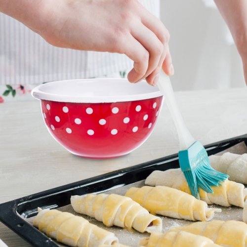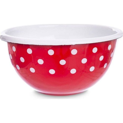 Součástí retro kolekce smaltovaného nádobí TEČKA je i tato červená miska s bílými puntíky a bílým okrajem .