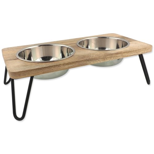 Praktická sada dvou nerezových misek v elegantním dřevěném stojánku s železnou konstrukcí. Ideální řešení pro podávání vody i krmiva, které spojuje funkčnost a moderní design.
