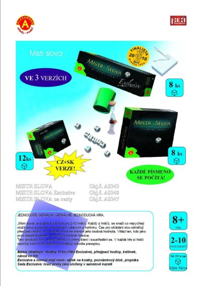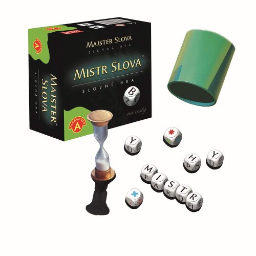 Slovní hra - menší, úsporné cestovní balení - Mistr slova je svižná slovní hra pro 2-10 hráčů. Hráči se snaží, v čase vymezeném přesýpacími hodinami, složit slovo z písmen na kostkách vržených z kelímku. Po složení slova se stanoví jeho bodová hodnota. Vítězí ten, kdo jako první dosáhne předem dohodnuté bodové hranice. Hra, přiměje účastníky přemýšlet i soustředit se. V každé hře si hráči rozšiřují svou slovní zásobu a osvěžují pravidla pravopisu. Nepotřebujte žádný hrací plán, nehrozí rozsypání písmenek při hře.