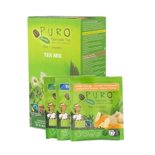 Mix čajů značky Puro: čaj pomeranč červený, čaj jahoda, čaj jablko-skořice, čaj citron, čaj lesní směs, čaj šípek, čaj matový, zelený čaj, čaj earl grey, čaj BIO heřmánkový, čaj BIO english breakfast, čaj BIO mátový