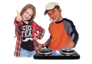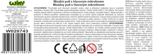 Mixážní pult s hlavovým mikrofonem. Rozměry 39x20 cm. Světelné a zvukové efekty. 4xAA baterie součástí. Svítící disco koule, 6 efektů disku, 16 efektů, 12 rytmů, 12 bubnů, nastavení tempa, hlasitosti, stojánek na mobil/mp3 přehrávač, automatické vypnutí pro šetření energie. Kabel pro připojení mobilu/mp3 přehrávače.