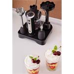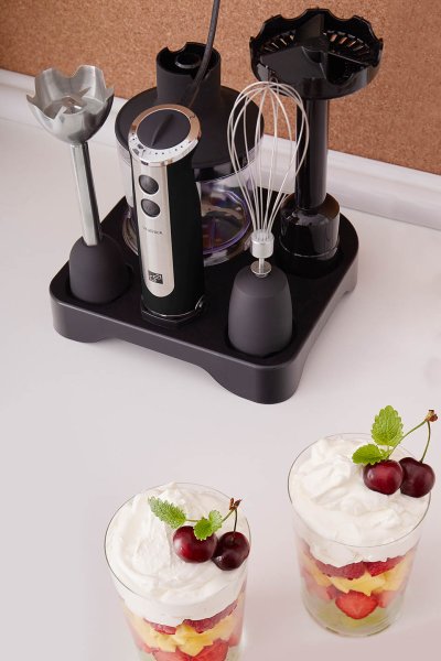 Celé tělo mixéru je kovové. Krásný design a promyšlený tvar vám umožní absolutně pohodlnou manipulaci i držení. Mysleli jsme na všechno, takže oceníte i vstřícně umístěné ovládací prvky a praktický stojan, do kterého mixér i s příslušenstvím snadno umístíte.