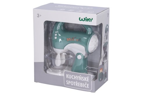 Mixér s efekty. Velikost 16x6x12 cm. Baterie 2xAA, nejsou součástí. Vydává světelné a zvukové efekty. Baterie jsou umístěny zespod mixéru, který je nejdříve potřeba odcvaknout od podstavce.