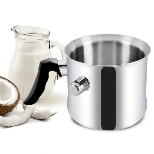 Mlékovar bez pokličky z kvalitní nerez oceli má dvojitou stěnu nádoby, do které lijeme vodu, aby zabránila připálení mléka i různých omáček, pudinků .