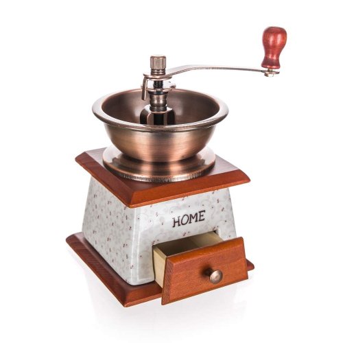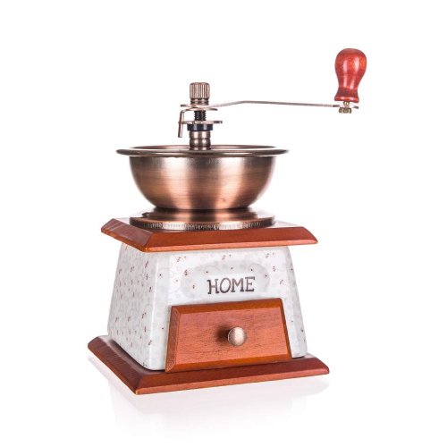 Ruční mlýnek na kávu HOME s keramickým mechanismem, dekorované keramické tělo s dřevěnými doplňky a kovovou násypkou. Keramickou mlecí mechaniku lze nastavit na požadovanou hrubost mletí.