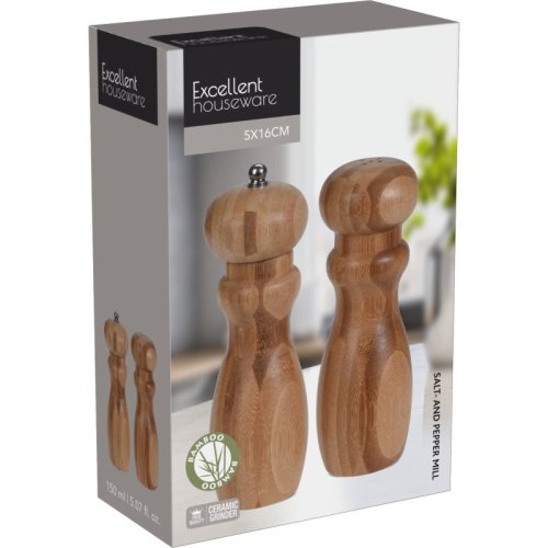 Stylová sada dvou mlýnků vyrobených z kvalitního bambusu (Edulis), která kombinuje přírodní vzhled s praktičností. Mlýnek na pepř je vybaven odolným keramickým mechanismem pro rovnoměrné mletí, zatímco mlýnek na sůl má PP zátku, která chrání obsah před vlhkostí. Díky objemu 150 ml jsou ideální pro každodenní použití a zároveň působí elegantně při servírování na stole.
