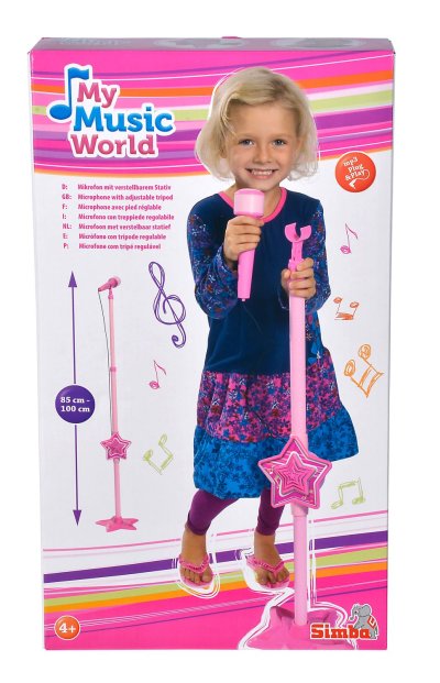 Růžový elektronický mikrofon se stojanem a se vstupem pro MP3. Nastavitelná výška 85-115cm.