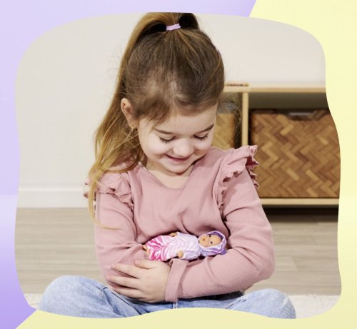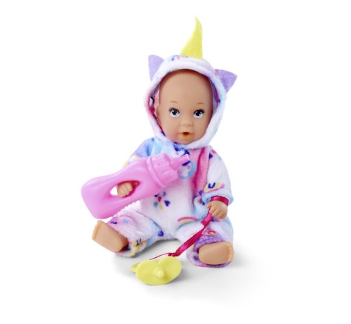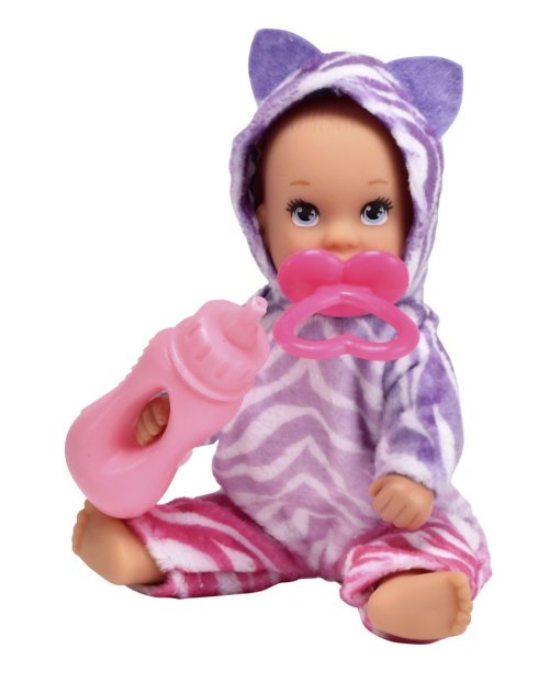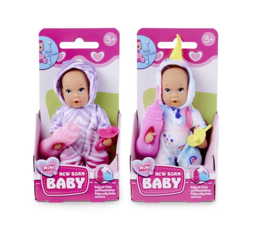 Panenka New Born Baby MINI pije a čůrá. Balení obsahuje lahvičku a dudlík. Pyžamo je ve dvou motivech - jednorožec, džungle. Výška panenky 12 cm.