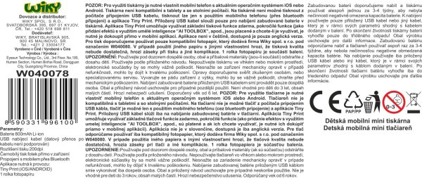 Mobilní mini tiskárna 8,8x8,3x4,5 cm. Bluetooth připojení. Aplikace TINY PRINT pro iOS/Android - funkce: tisk fotek, souborů, webových stránek, bannerů, šablon (pro úkoly, štítky, poznámky), rozpoznání textu, tvorba grafiky, komiksových portrétů, AI malování. 800mAh Li-ion baterie vestavěná. Tlačítko ON/OFF na pravé straně. Nastavení kvality tisku. 1 role fotopapíru součástí. Šířka fotopapíru 5,5 cm, tisknutelná šíře 4,8 cm.