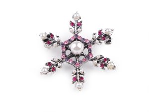 Elegantní brož s vločkou je osázená barevnými broušenými kamínky.